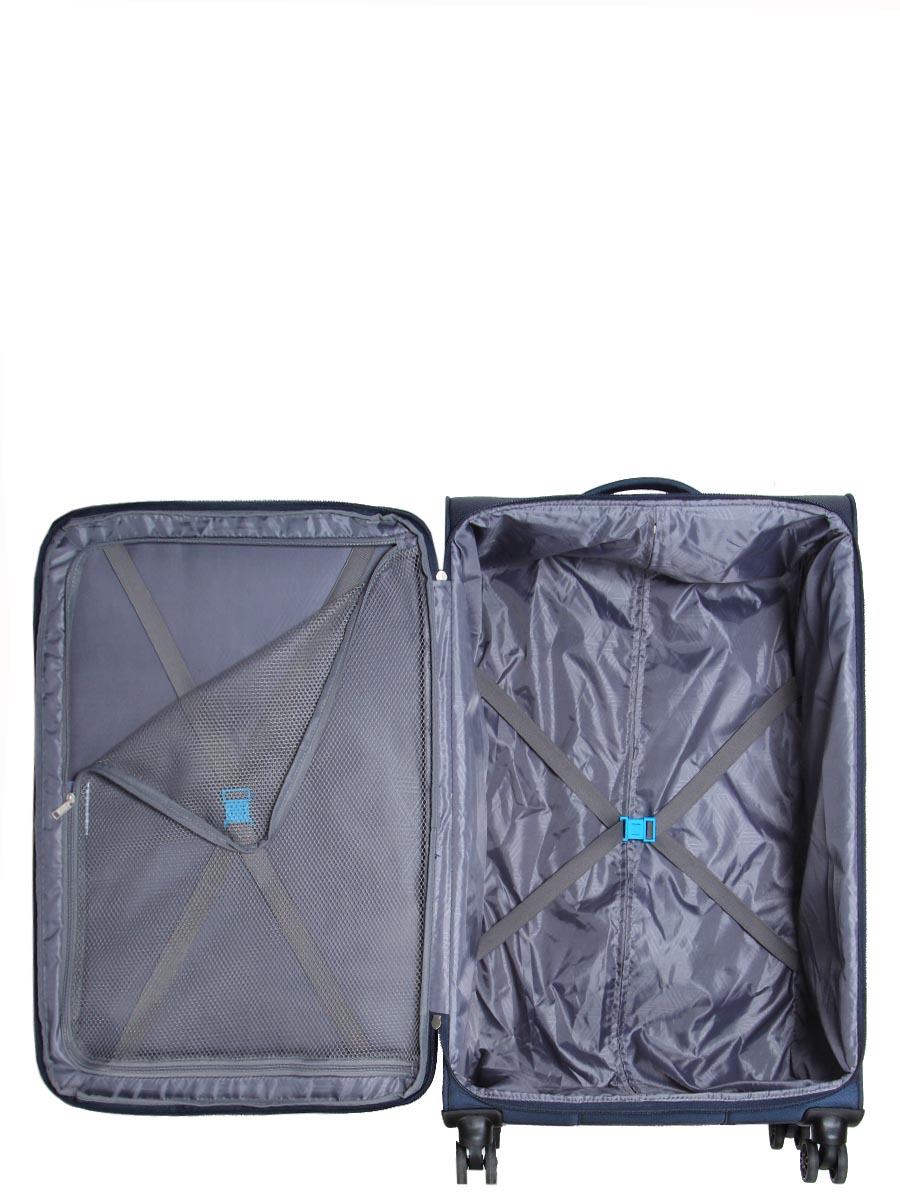 Cette grande valise American Tourister SummerFunk peut accueillir quantité de vêtements grâce à sa contenance de 109.5 L. A noter que son soufflet extensible lui permet d’atteindre un volume total de 119 L ! Son organisation intérieure permet un rangement ordonné des affaires. Elle est munie d’un grand compartiment principal pour les pantalons, pulls et t-shirts, de sangles élastiques croisées pour maintenir le tout en place, d’un compartiment plat en filet avec 2 sangles papillons pour y glisser une veste ou un trench par exemple, et d’une doublure intégrée. Elle est aussi dotée d’une profonde poche avant dans laquelle peut être glissée une serviette de bain. Une seconde poche frontale peut quant à elle stocker les cahiers de vacances des enfants.