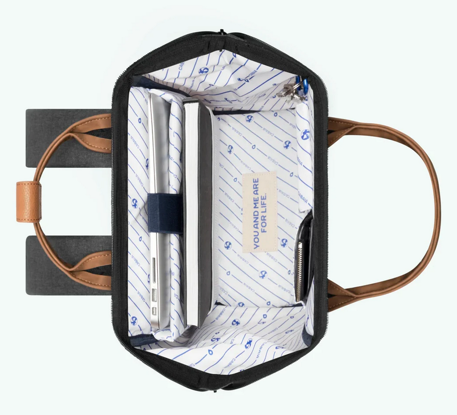 Pratique, avec son volume généreux, il s’ouvre largement grâce à son zip et contient une poche matelassée pour un ordinateur 13 pouces, une poche en filet pour une tablette type iPad, une poche à soufflets pour le téléphone et une poche plate dans la doublure.