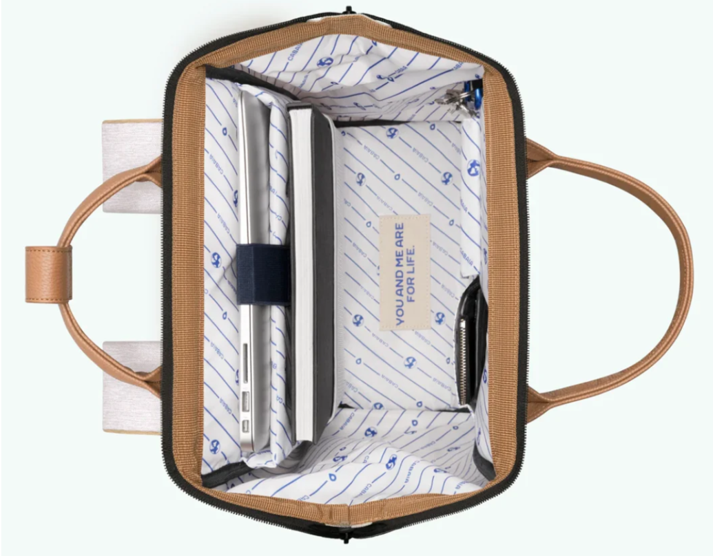 Pratique, avec son volume généreux, il s’ouvre largement grâce à son zip et contient une poche matelassée pour un ordinateur 13 pouces, une poche en filet pour une tablette type iPad, une poche à soufflets pour le téléphone et une poche plate dans la doublure.