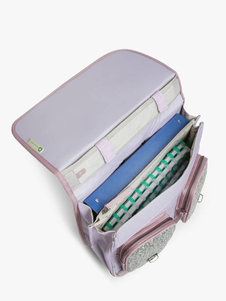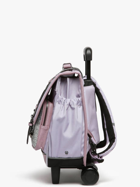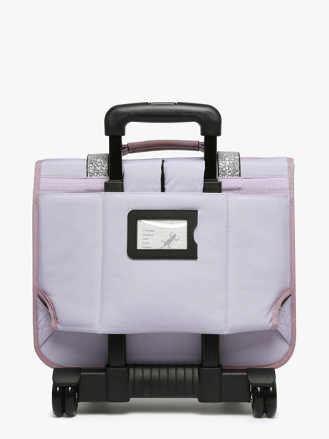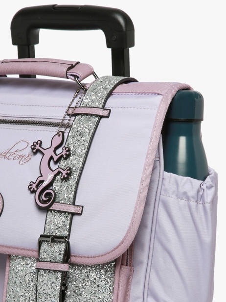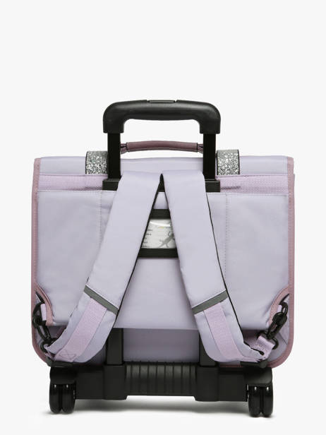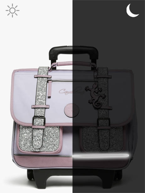 38 cm – 21 litres – 2.33 kg ~ Cartable à roulettes 38 cm de la ligne Vintage Fantasy signé Caméléon. Idéal pour le CP, CE1 et CE2. Composé de 2 compartiments séparés par une poche centrale zippée, ce cartable enfant est pensé pour ranger toutes les affaires scolaires. Les trois poches extérieures zippées sont idéales pour ranger les petits effets comme l’agenda ou le goûter. Fonctionnel, le cartable a un emplacement pour la gourde à l’extérieur. Pour faire rouler le cartable, les bretelles doivent être rangées dans la poche au dos. A la fois renforcé et rembourré, ce modèle assure confort et résistance. Côté sécurité, ce cartable dispose de bandes réfléchissantes sur le devant et sur les bretelles du cartable. Le cartable à roulettes Caméléon est fabriqué en polyester recyclé imperméable. Petit plus, la règle est offerte !
