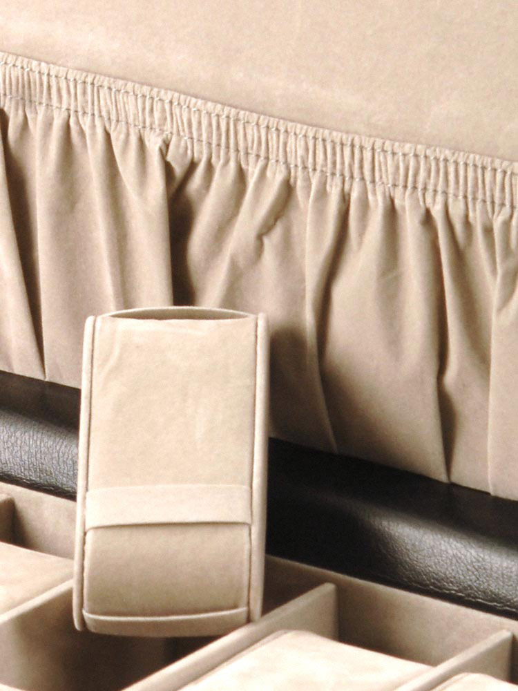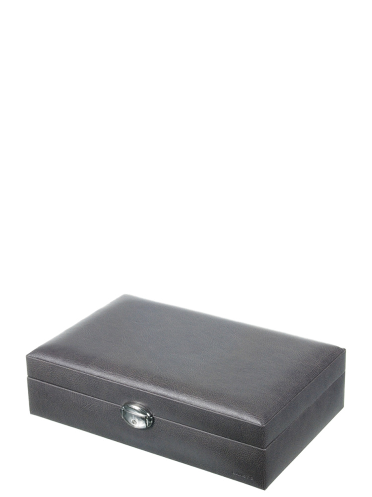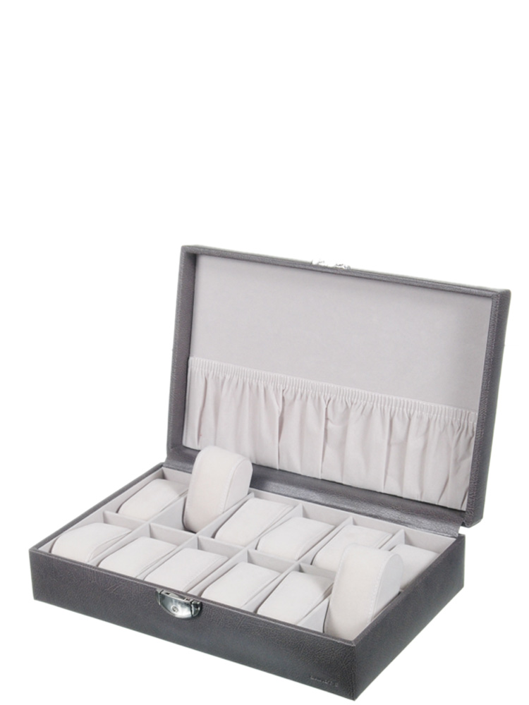 Coffret en synthétique façon cuir de Davidt’s. Il est spécialement conçu pour y ranger 12 montres ou bracelets. Les petits coussins amovibles et l’intérieur du coffret sont en suédine. Plateau de fermeture avec serrure à clé.