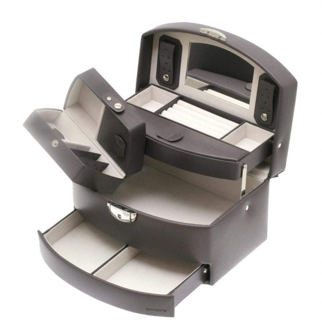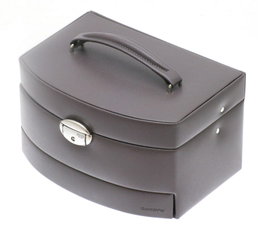 Coffret bijoux en synthétique façon cuir par Davidt’s. Il possède un tiroir qui coulisse lors de l’ouverture du couvercle, des emplacements pour boucles d’oreilles, bagues, bracelets et colliers, une fermeture à clé, un miroir de courtoisie et un coffret pour quelques bijoux lors de voyage.