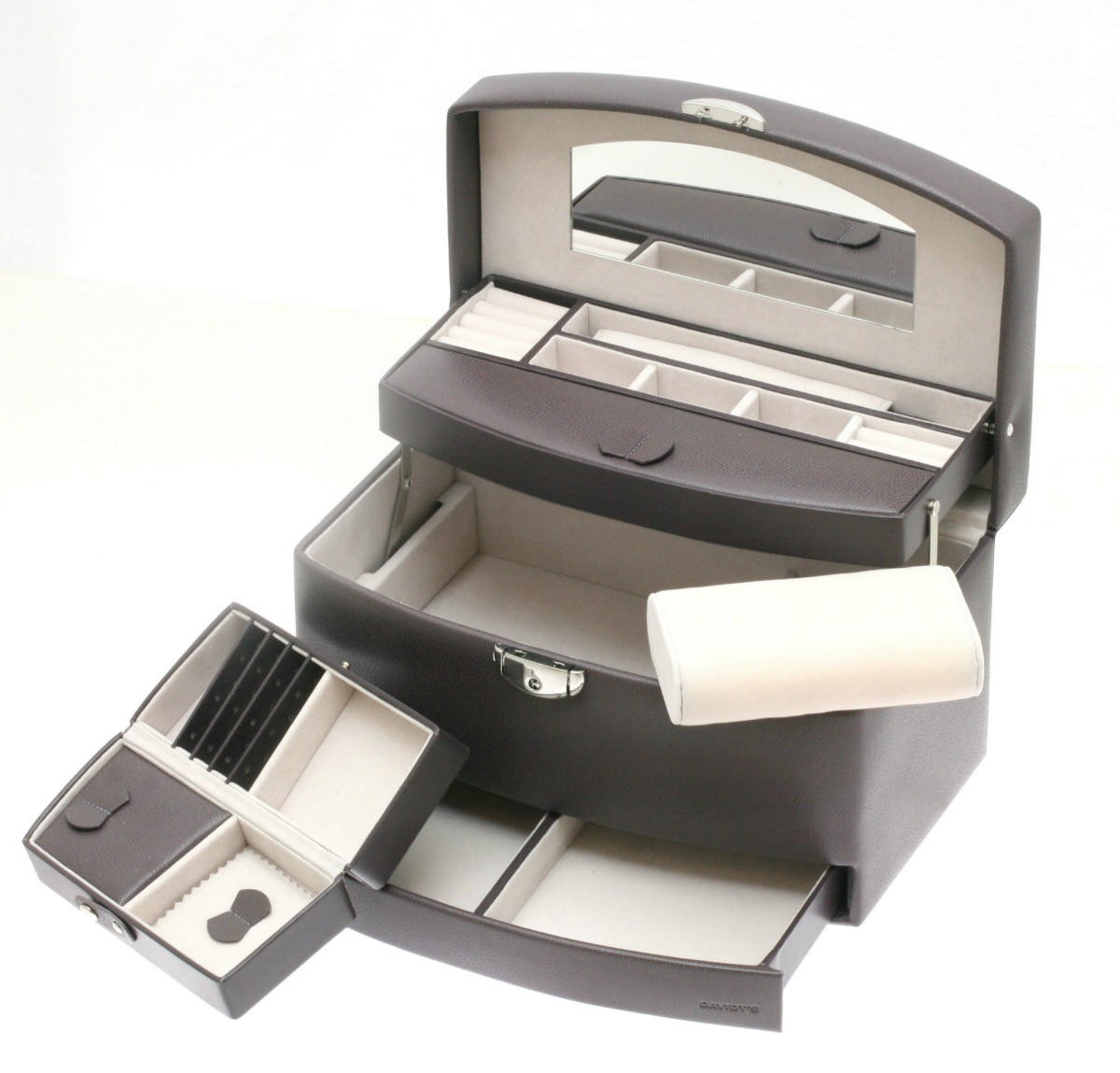 Equipement coffret bijoux: Baguier, Compartiments boucles d’oreilles, Miroir de courtoisie, Coffret amovible de voyage, Compartiments colliers, Plateau coulissant, Compartiments bracelets