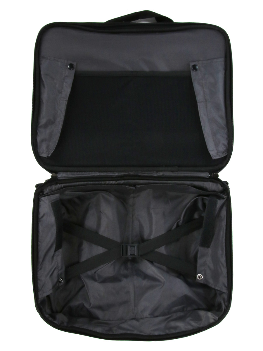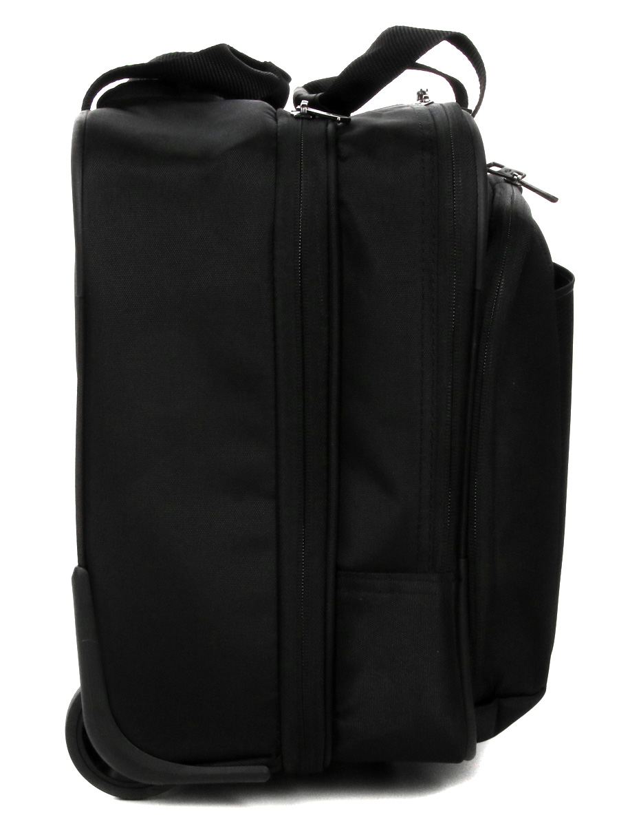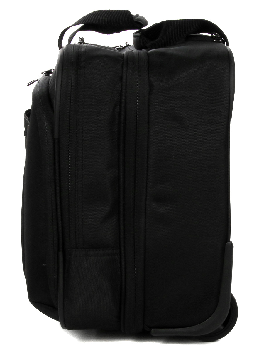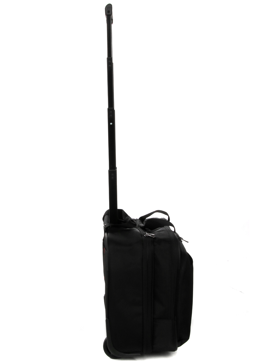 Ce pilot case souple Samsonite Guardit 2.0 se ferme à l’aide d’un zip imperméable puisqu’inversé. A l’extérieur, il est bien équipé pour simplifier les déplacements de ses usagers : un trolley réglable double tube, rangé dans une poche supérieure, 2 roulettes silencieuses, un passant compatible trolley au dos, ainsi que 2 poignées de portage si vient le besoin de le déplacer à la main, autrement qu’en le tractant comme une valise par terre.