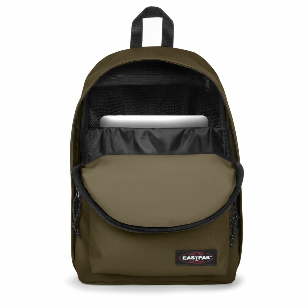 Côté intérieur, ce sac à dos Eastpak Out Of Office dispose d’un grand compartiment principal, muni d’une large poche ordinateur. Cette dernière est renforcée, fermée par un scratch et permet le rangement d’un ordinateur portable 13.3 pouces en toute sécurité. Au dessus, une petite poche filet peut servir a sérier ses accessoires. A l’extérieur, il est équipé d’une petite poche zippée, pratique pour un rangement de dernière minute.