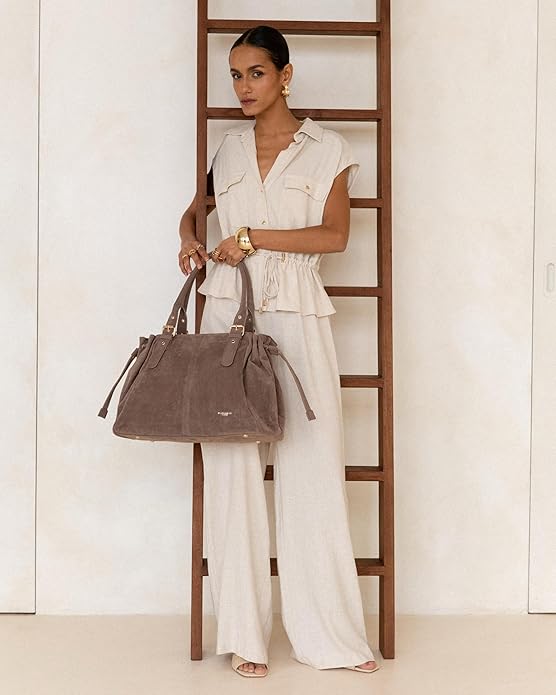 - MATIÈRE & DÉTAILS : Confectionné en similicuir à l’aspect suédé, doux au toucher et résistant à l’usure. Finitions métalliques dorées et coutures soignées apportant une touche de sophistication discrète. Style élégant, adapté au quotidien comme aux sorties.
