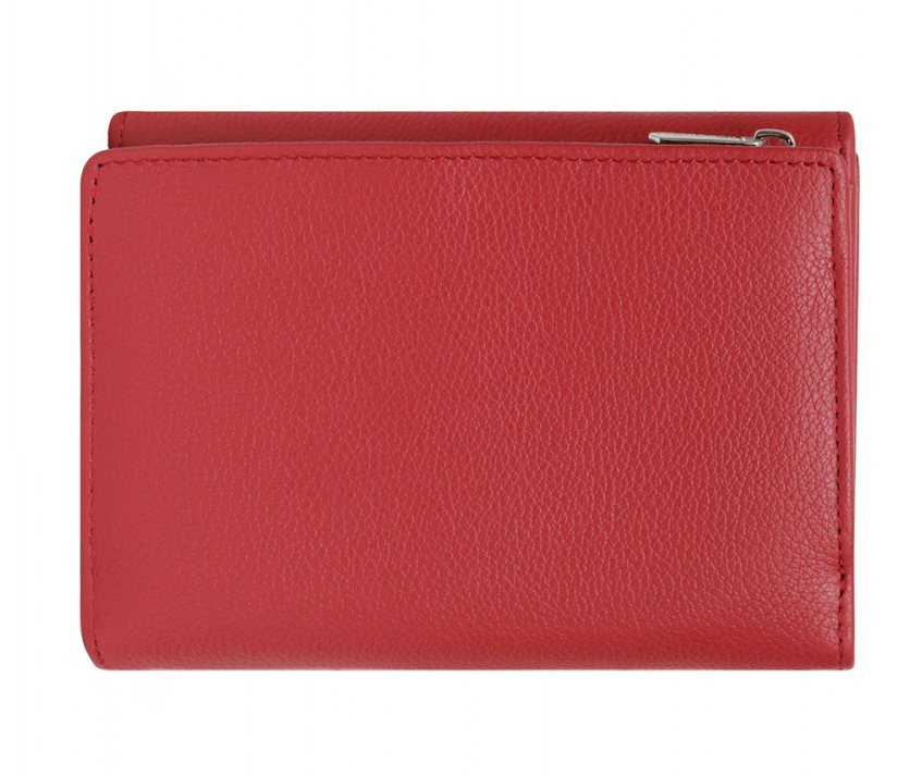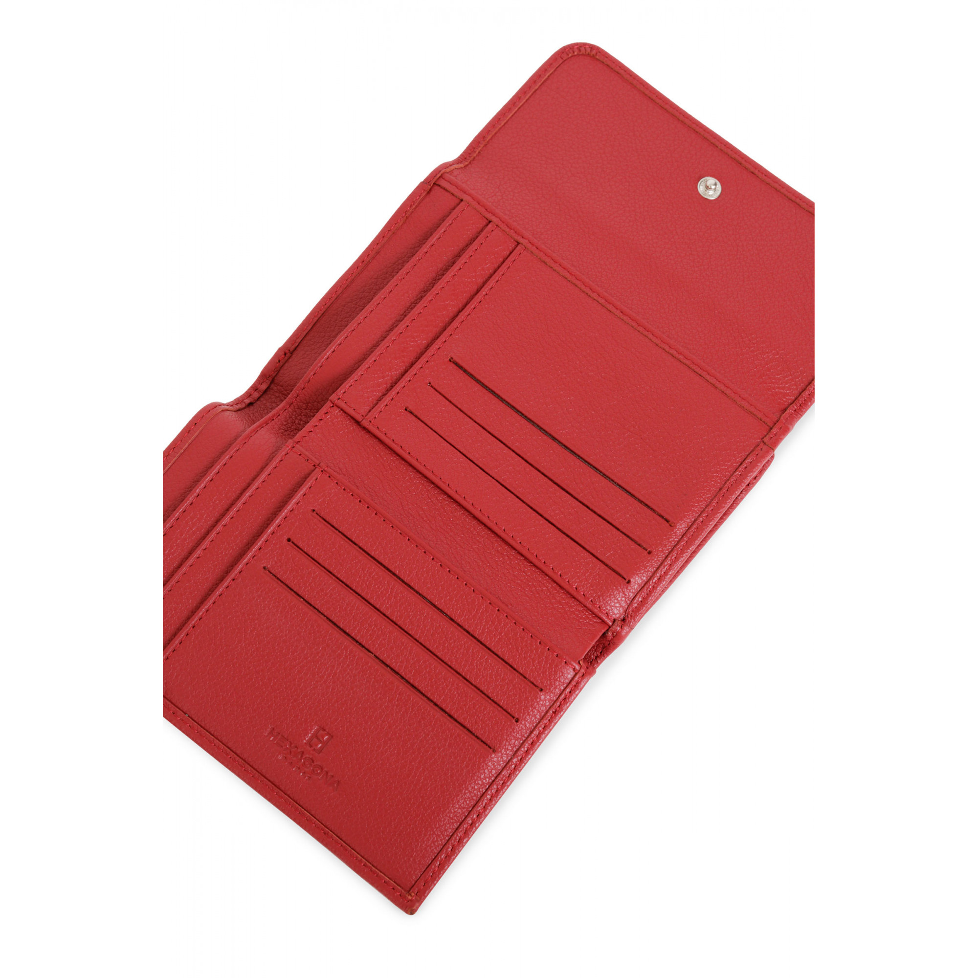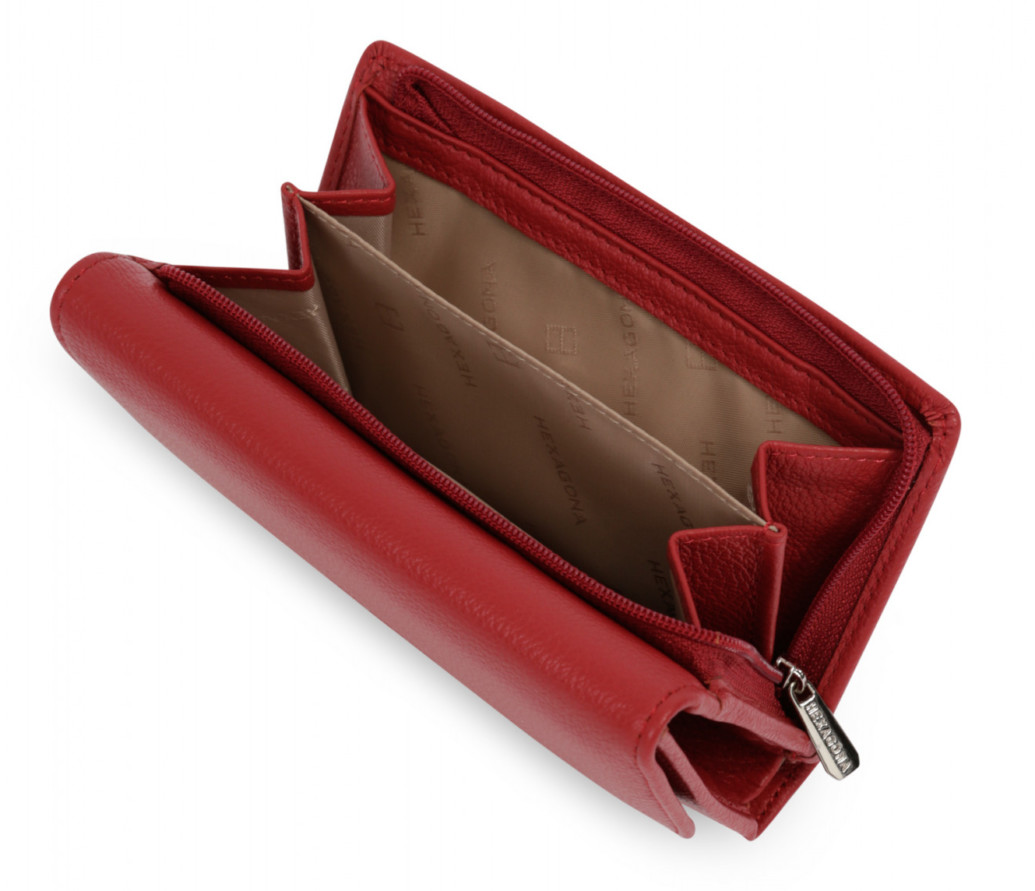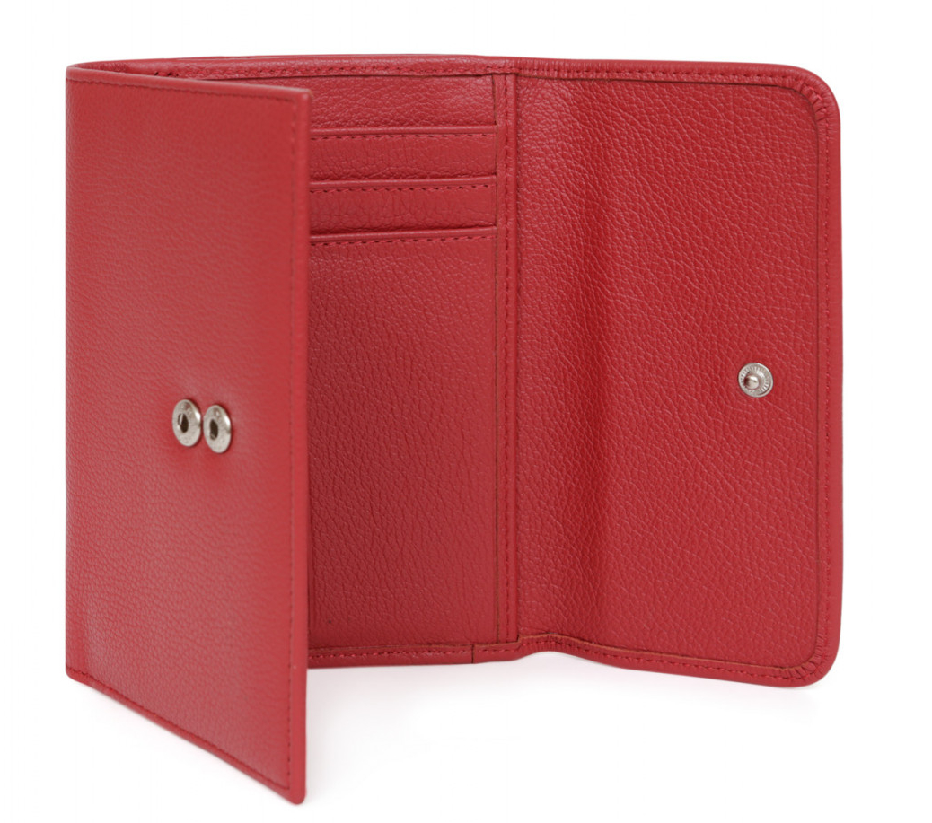Intérieur : un volet, quatre poches plates, un porte-monnaie zippé avec deux compartiments principaux, deux poches billets et six emplacements carte