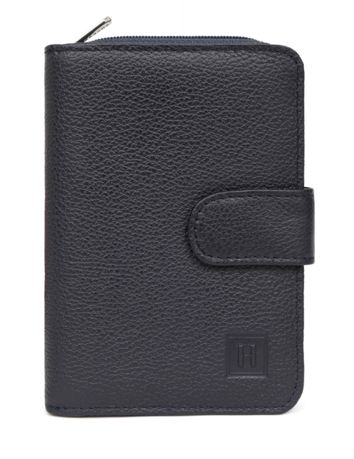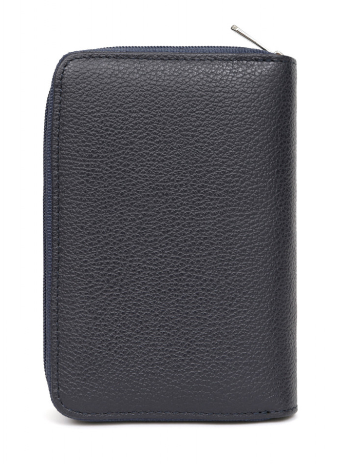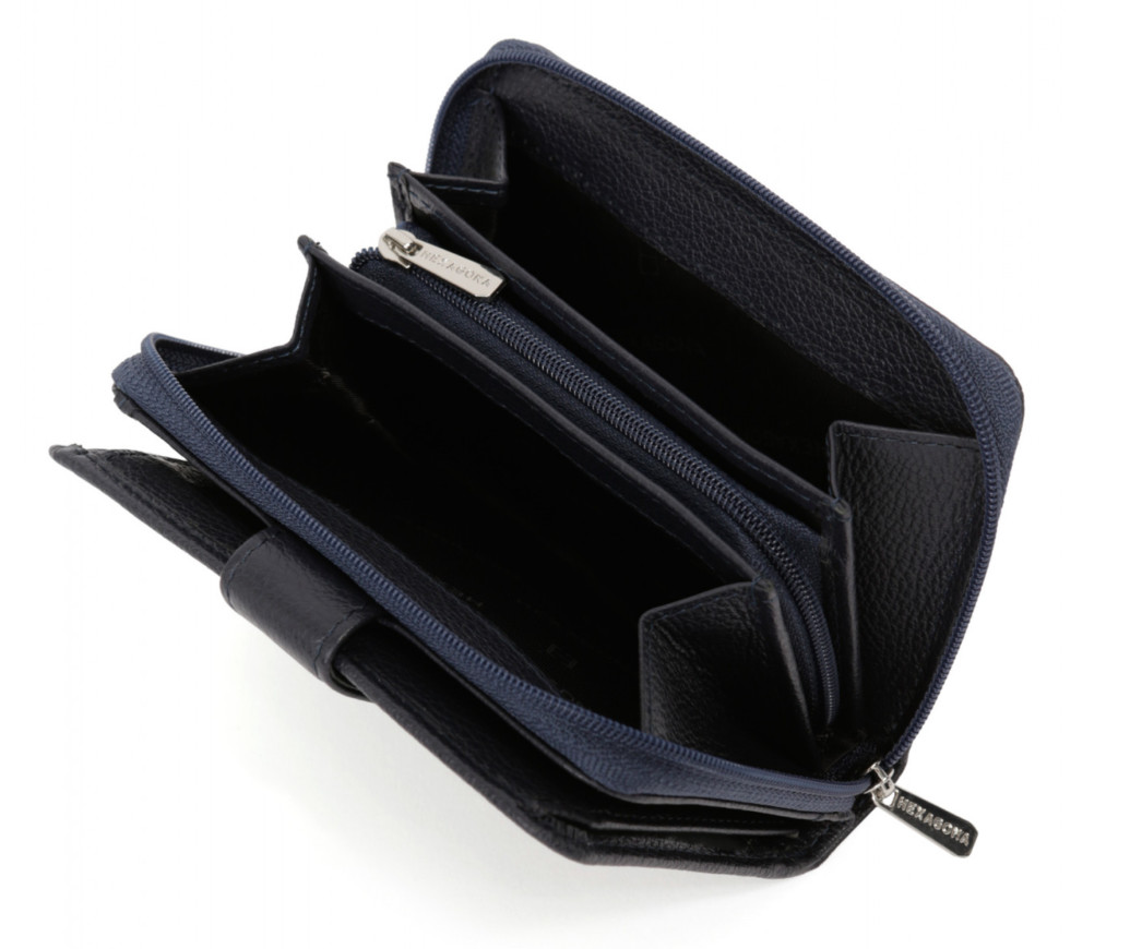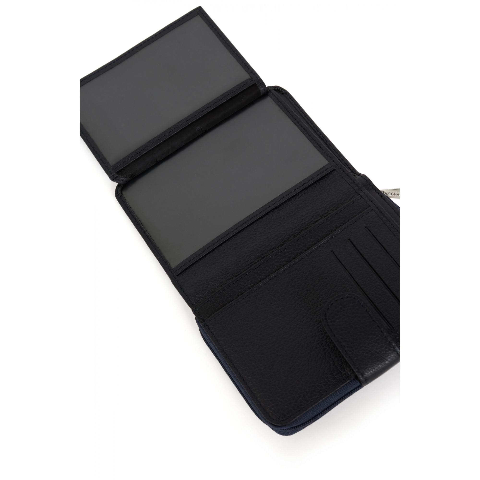 Intérieur : deux volets, quatre poches plates (dont deux à vue transparente), un porte-monnaie zippé avec trois compartiments principaux (dont un zippé), une poche billets et six emplacements carte