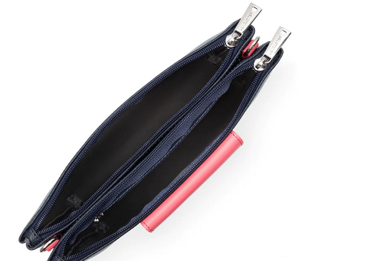 Porte carte frontal, poche avant zippée, poche intérieure zippée, poche arrière zippée