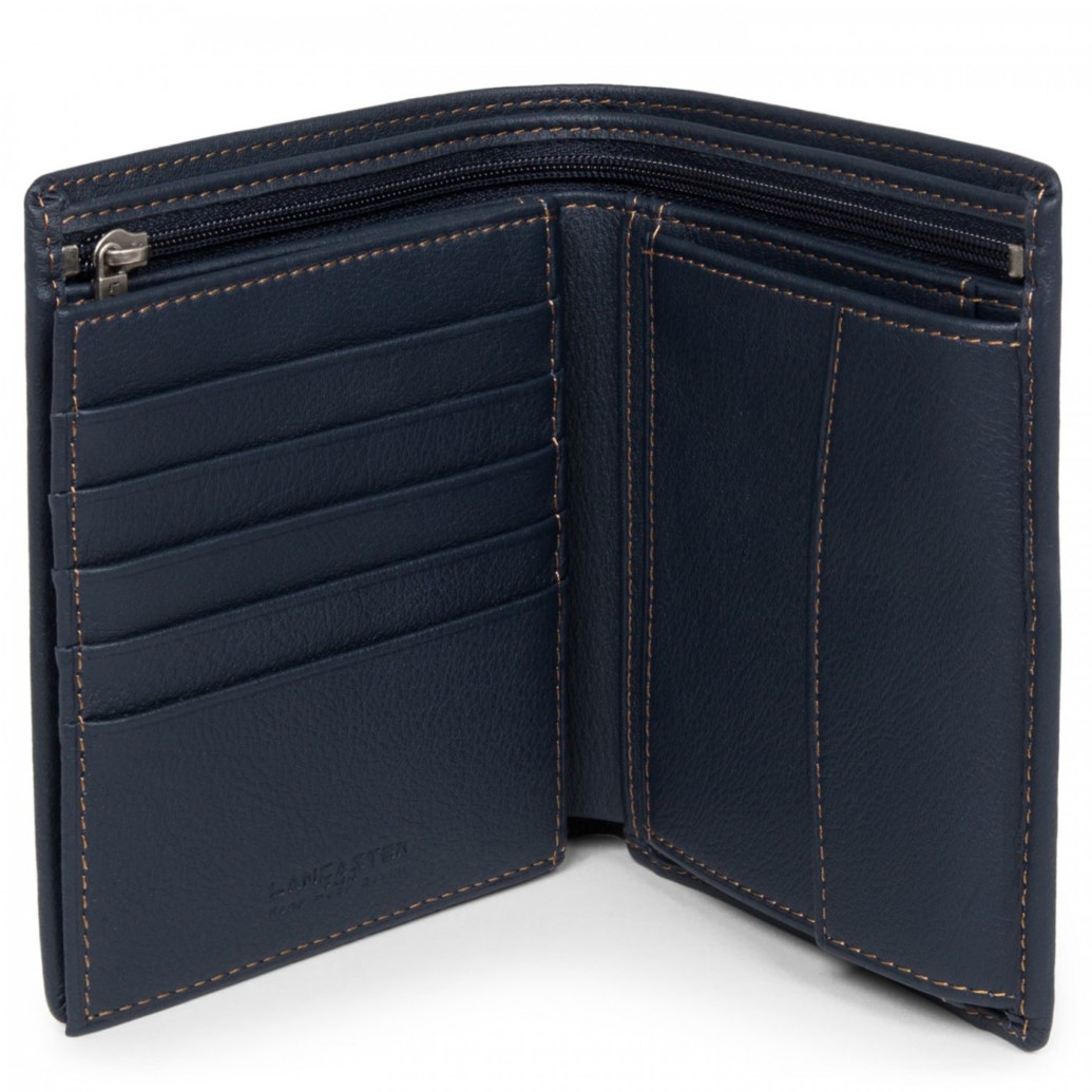 Portefeuille en cuir de vachette pleine fleur sauvage de Lancaster. Il s’organise avec deux poches billets et un grand zip central, un porte-monnaie avec bouton de pression, 10 emplacements pour cartes bancaires, deux poches transparentes pour carte d’identité et permis de conduire (non compatible pour la carte grise).