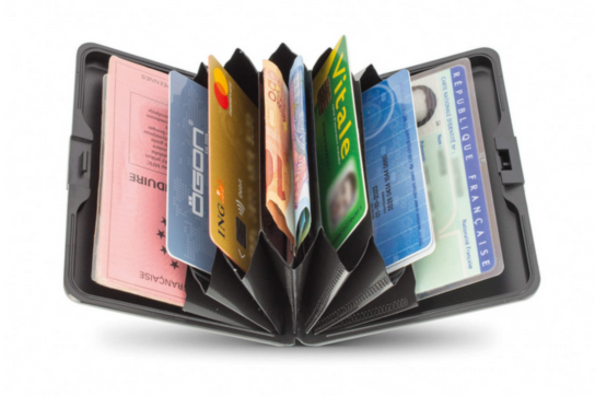 Portefeuille Ogon, rigide, en aluminium, idéal pour homme et femme. Allez à l’essentiel  : quelques billets, cartes bancaires, carte d’identité, permis de conduire.