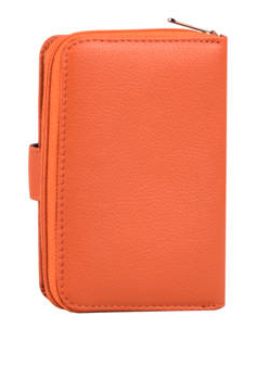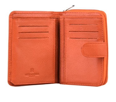 Intérieur : deux volets, quatre poches plates (dont deux à vue transparente), un porte-monnaie zippé avec trois compartiments principaux (dont un zippé), une poche billets et six emplacements carte