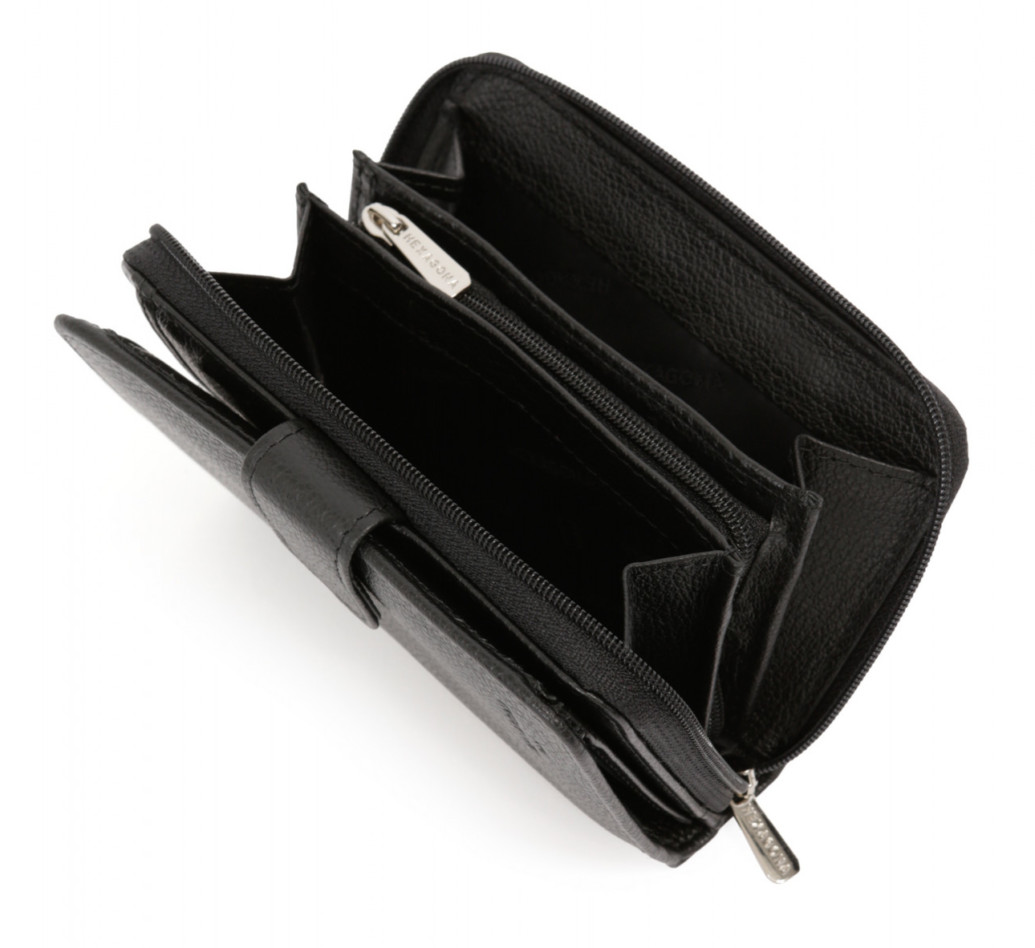 Intérieur : deux volets, quatre poches plates (dont deux à vue transparente), un porte-monnaie zippé avec trois compartiments principaux (dont un zippé), une poche billets et six emplacements carte