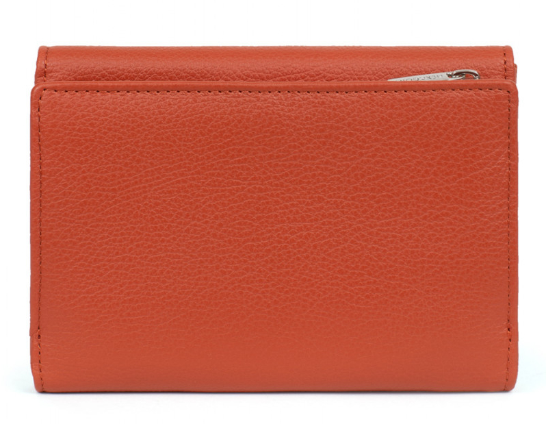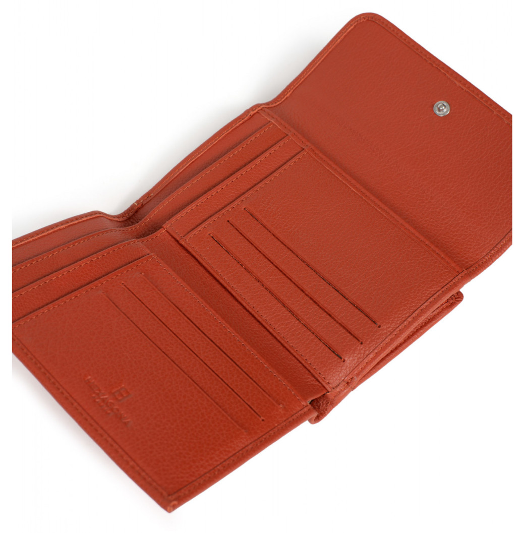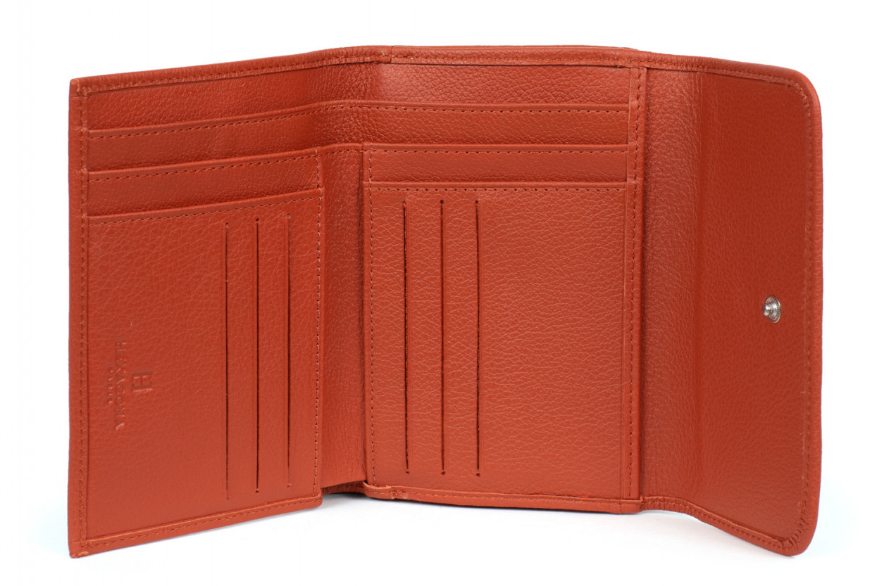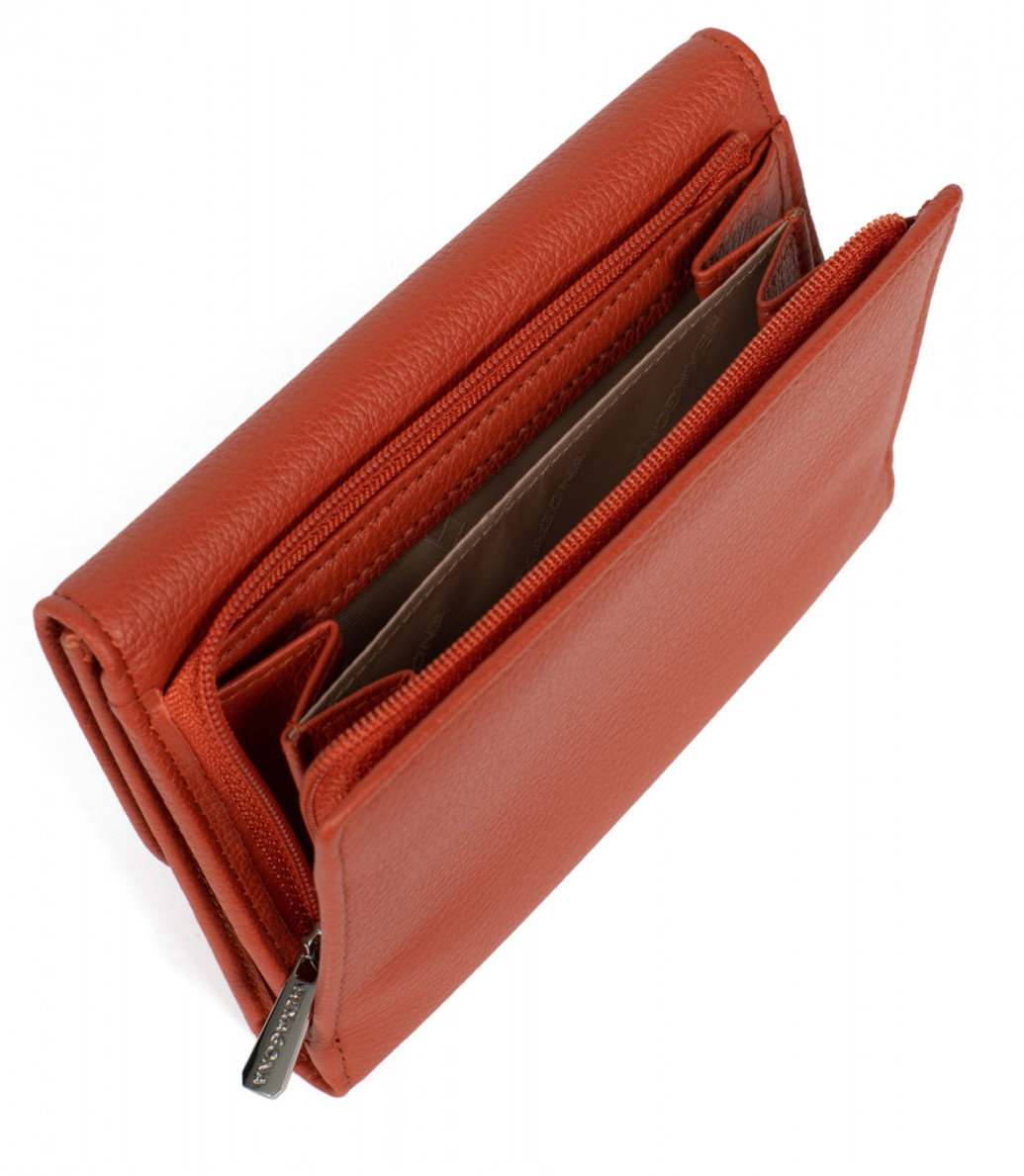 Intérieur : un volet, quatre poches plates, un porte-monnaie zippé avec deux compartiments principaux, deux poches billets et six emplacements carte
