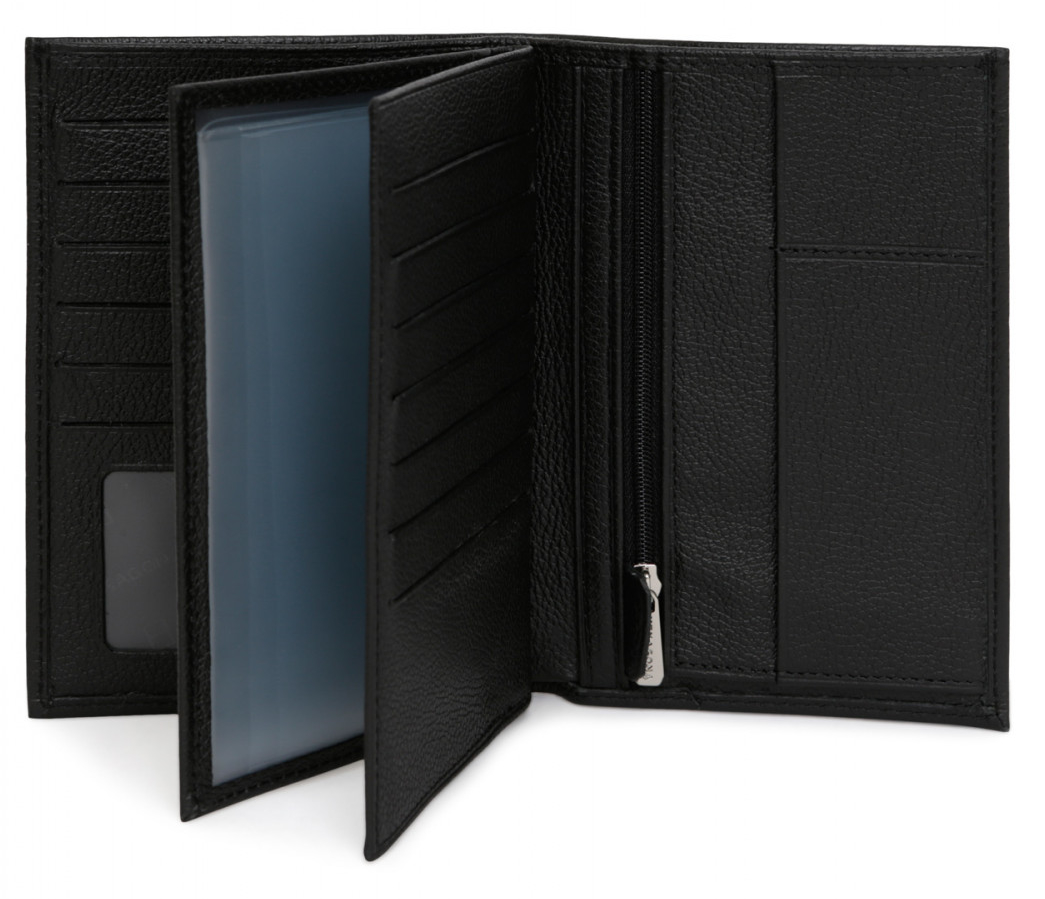 Intérieur : trois volets, six poches plates (dont deux à vue transparente), un porte-monnaie zippé, une poche billets, 21 emplacements cartes