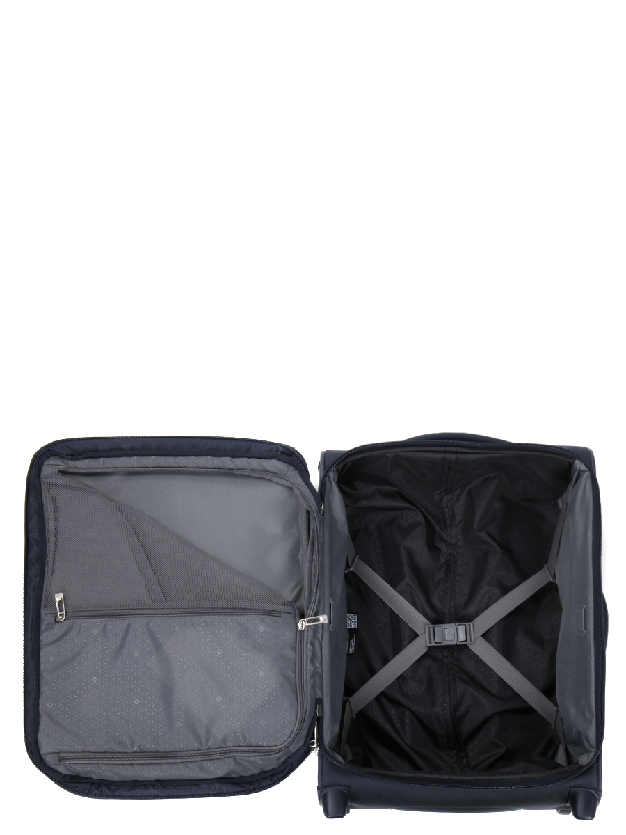 Les deux compartiments de la valise cabine Samsonite Respark son séparés par une cloison zippée disposant d’une poche pour retrouver facilement les accessoires. Des sangles élastiques permettent de maintenir les tenues en place dans le compartiment inférieur. Une grande poche frontale permet d’emporter des dossiers A4 et un ordinateur jusqu’à 15.6 pouces grâce à sa poche intérieure matelassée. Des livres trouvent quant à eux leur place dans la poche frontale située par-dessus.