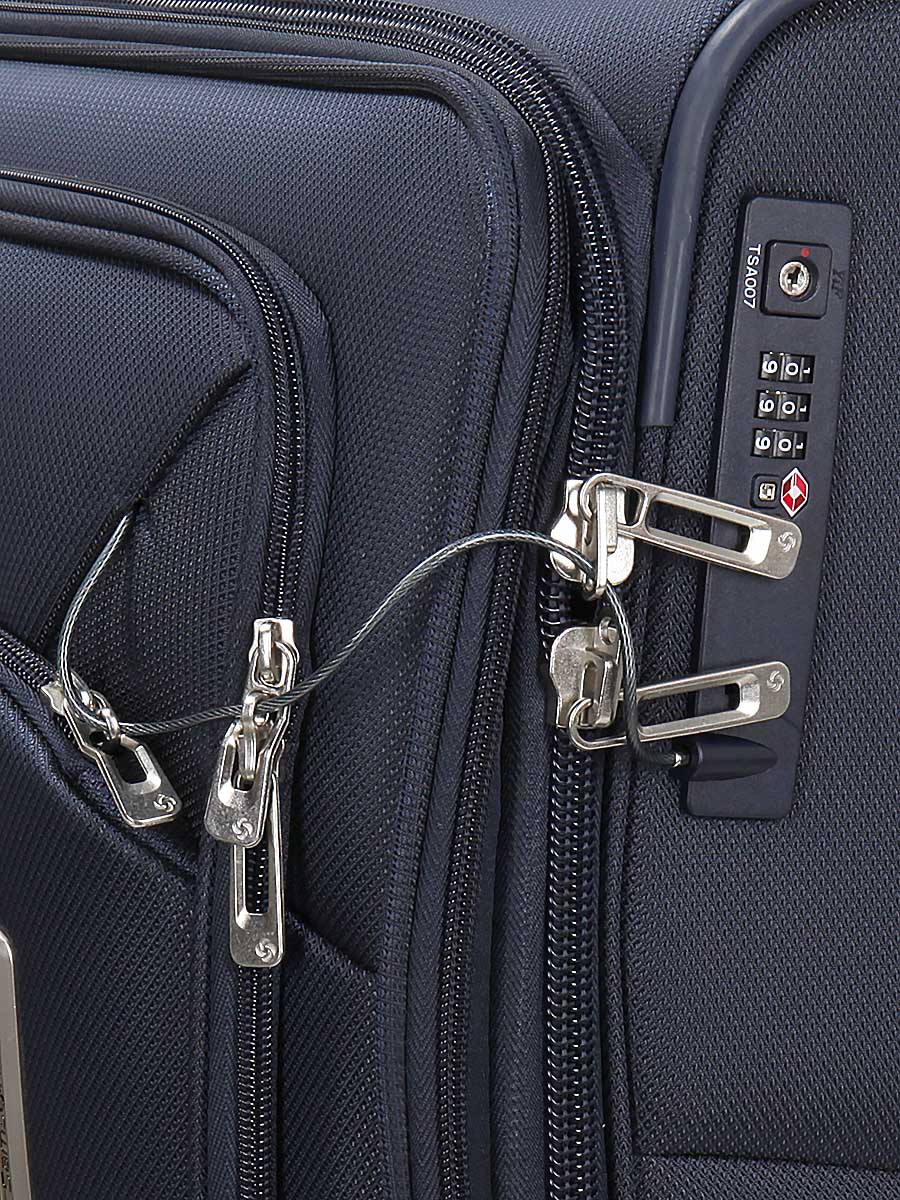 Le trolley double tube ajustable et les quatre troues de la valise extensible Samsonite Respark lui offrent une grande stabilité et la possibilité de rouler à 360° pour une maniabilité accrue. Chaque fermeture à glissière peut être sécurisée par le câble qui se glisse dans les perforations et finit sa courses dans la serrure TSA à code. Le porte étiquette rétractable situé sur le côté permet de la restituer aisément à son propriétaire en cas de perte.