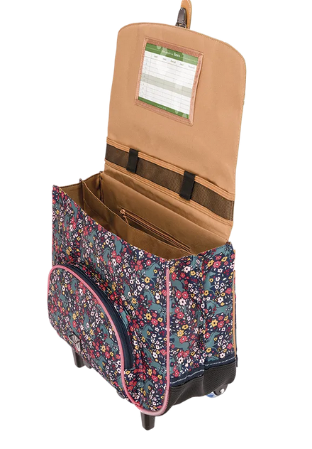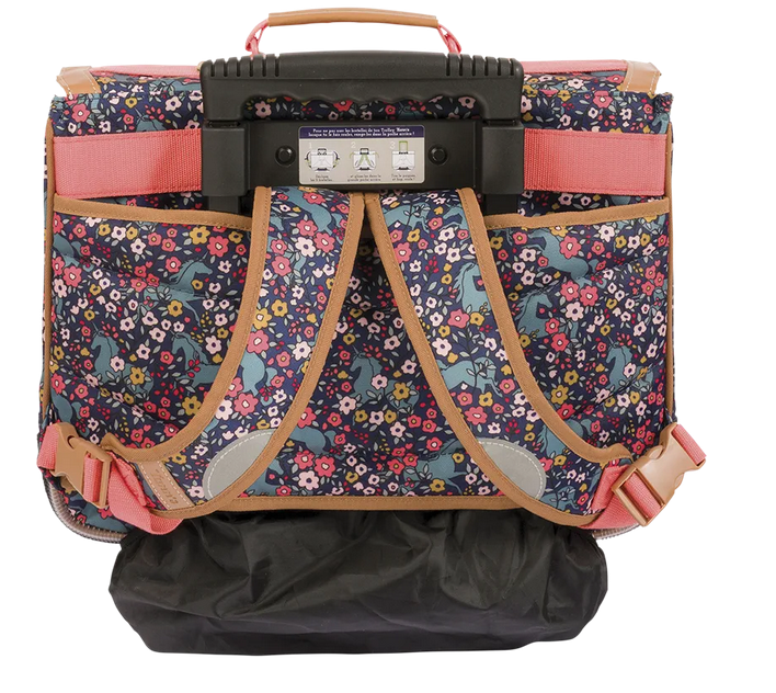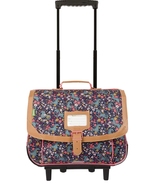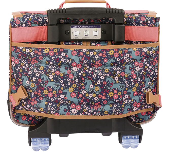 Un cartable trolley pratique et poétique avec un joli motif de fleurs où se cachent des licornes discrètes. Ce cartable trolley Tann’s d’un dos de 38 cm est adapté aux classes du CP/CE1/CE2.
