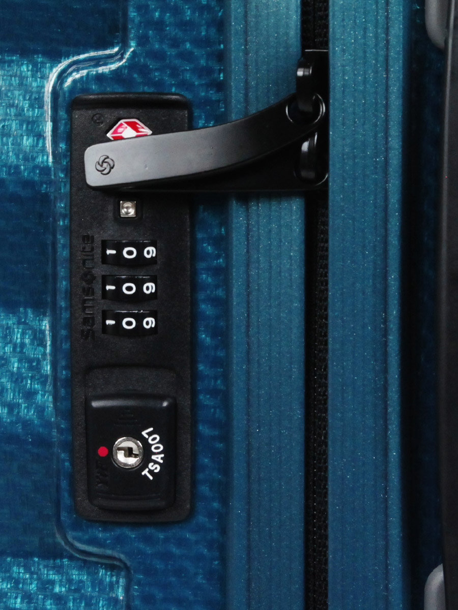 Cette valise 4 roues Samsonite Lite Shock utilise un système de fermeture à glissière de qualité, doté d’un zip étanche et sécurisé par une serrure à code TSA intégrée. Celle-ci est fortement conseillée pour voyager vers les USA, les douaniers américains disposant d’une clé spéciale pour ouvrir toutes les valises qu’ils souhaitent inspecter. A l’extérieur, on trouve également un porte adresse au dos.