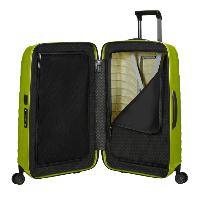 Valise rigide 69 cm Proxis extensible signée Samsonite. Cette valise proxis est réalisée à partir de Roxkin, du polypropylène en multicouche, un matériau exclusif développé par Samsonite. Performante, cette valise rigide est très légère et résistante. Sa coque reprend facilement sa forme en cas de chocs. Son intérieur est doté de deux compartiments distincts avec sangles de maintien pour vos vêtements. Vous pourrez vous inscrire au programme wecare de Samsonite et ainsi personnaliser votre bagage Samsonite avec une petite étiquette en cuir. Ergonomique, la valise Samsonite est dotée de quatre roues doubles silencieuses. Fabriquée en Europe, cette valise 69cm sera parfaite pour un séjour d’une semaine.